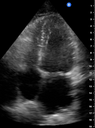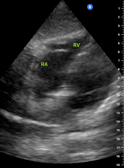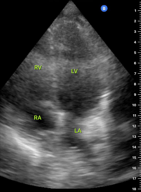 This view looks at the heart from the apex. When done properly, it achieves a horizontal cut of the heart that demonstrate all four chambers simultaneously. Consequently, its main utility is to assess the relationship between LV and RV. Beware, differentiating the chambers by ventricle size or thickness is not recommended, and it could lead to confusion in case of RV enlargement.