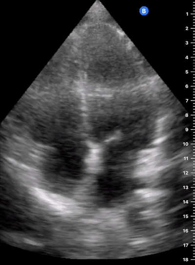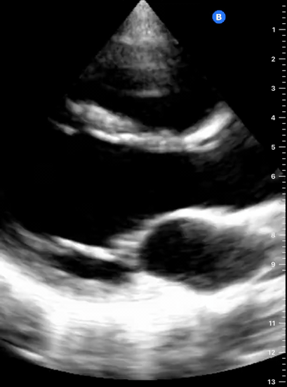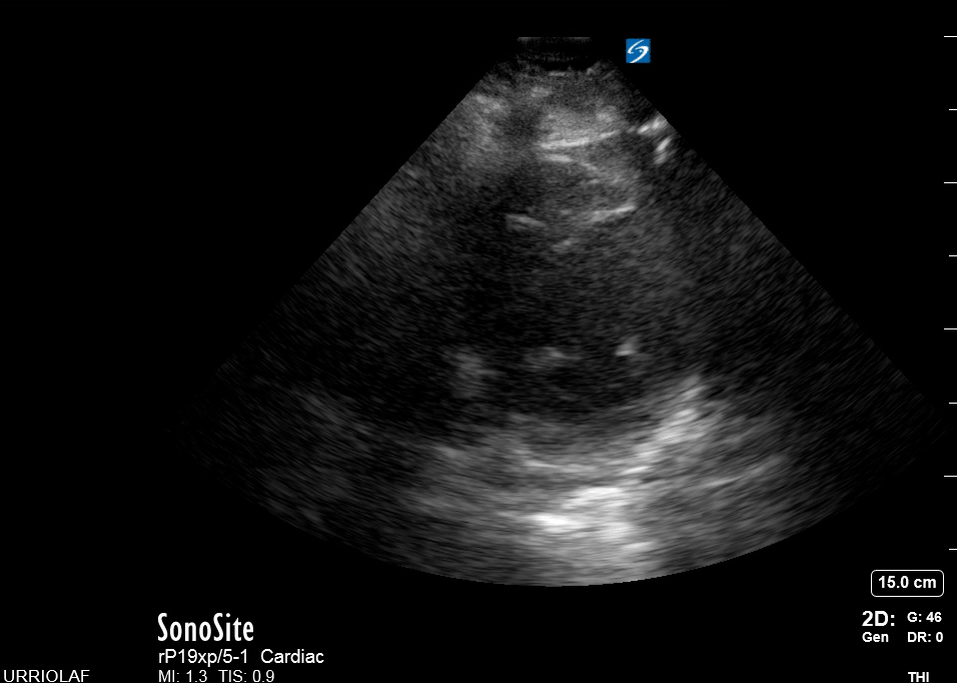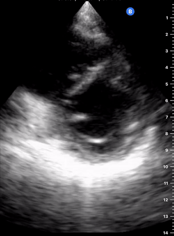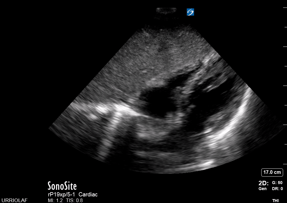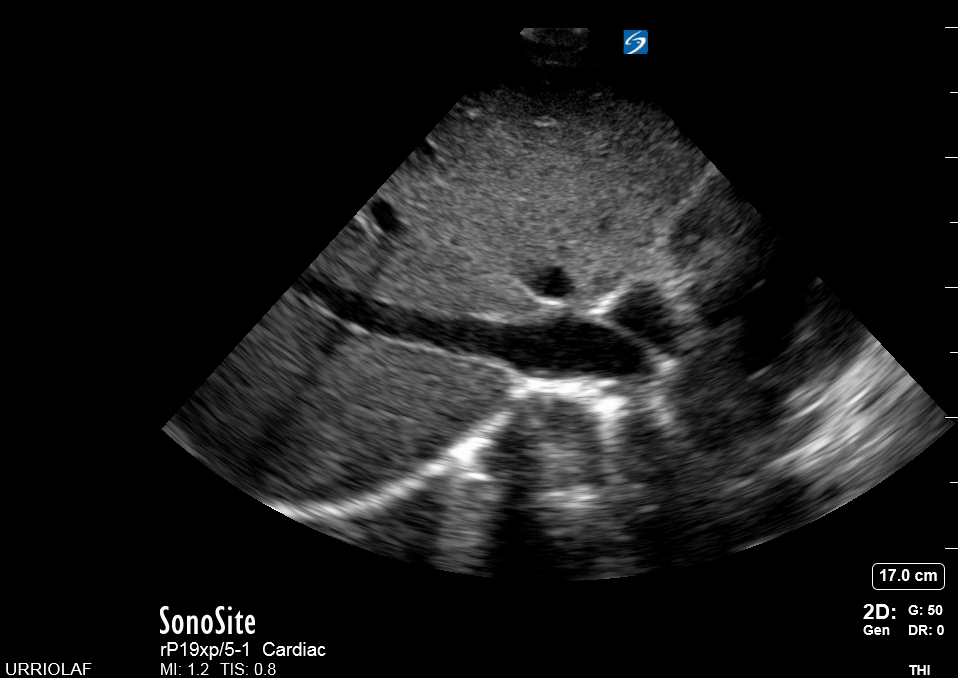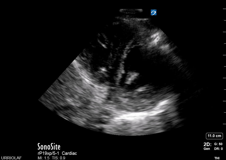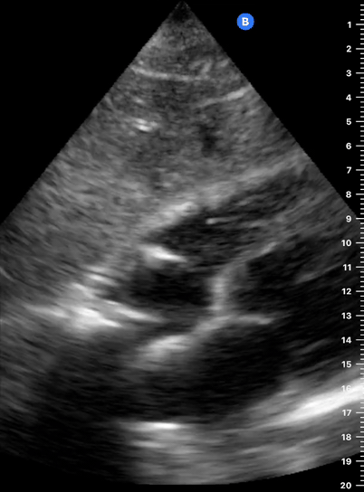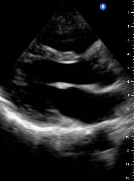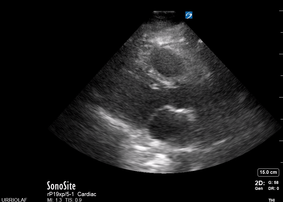 Remember that in the cardiac preset, the screen marking is on the right side. As a result, and unlike the FAST exam, the probe marking points towards the patient’s left. This view is used mainly to look for pericardial fluid, but it also provides information about ventricle size, chamber relationship and valvular abnormalities.