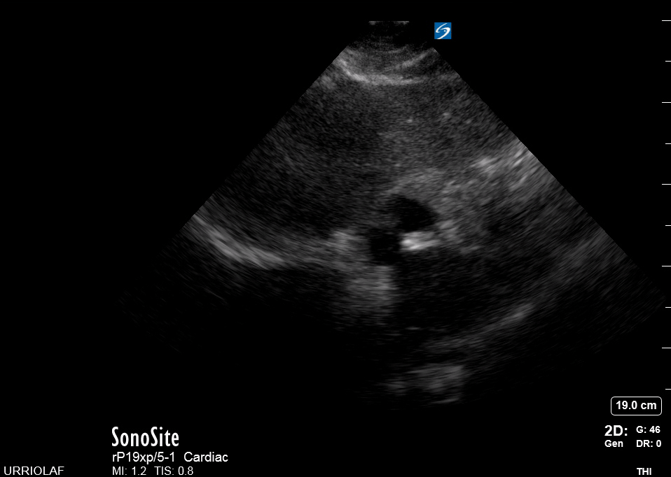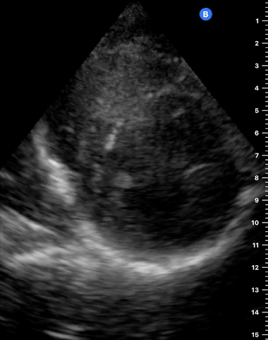 This is the standard window taught in FAST and might be the only one available during cardiopulmonary resuscitation (CPR). This view uses the liver as an acoustic window. To obtain good visualization is essential to handle the probe almost parallel to the anterior abdominal wall, trying to place it under the xiphoid process, pointing to the left shoulder. A deep inspiration or half inspiration can be useful to bring the heart closer to the probe and improve visualisation.