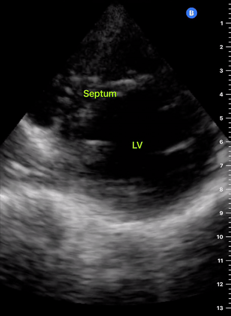 Place the transducer at the apex beat and angle it towards the right scapula. The correct image results from sliding the probe until the interventricular septum is in the middle of the screen, vertically dividing both sides of the heart. If using a cardiac preset, the probe’s marker points towards the patient’s left arm. Simpler, in this view, the probe notch should meet the marking on the screen, which is fundamental to avoid confusion.